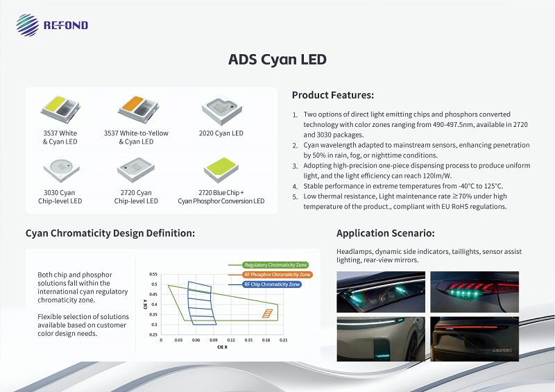 聚焦车辆环境感知增强与道路环境协同通信,本次研讨会议凯发k8官网展出的ADS Cyan 蓝绿光LED,采用直发光芯片/荧光粉双技术路线,打造高辨识度与可见度智驾标识,色区覆盖主波长490-497.5NM,在雨雾/夜间穿透力提升30%,可适用前照灯、传感器辅助光源及V2V信号标识场景,且符合欧盟ROHS认证。